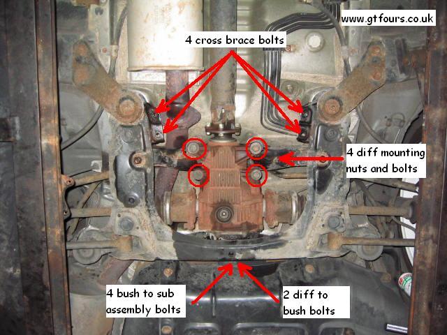 There are 14 bolts to undo - no more, no less! 4 - diff bush to rear sub assembly 2 - centre of bush, connecting bush onto rear of diff