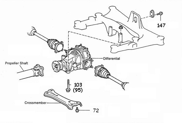 4 - cross brace (big one, can miss it!) (already removed in this picture) 4 - holding diff onto car |