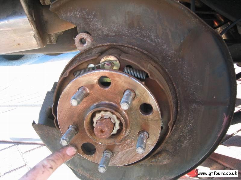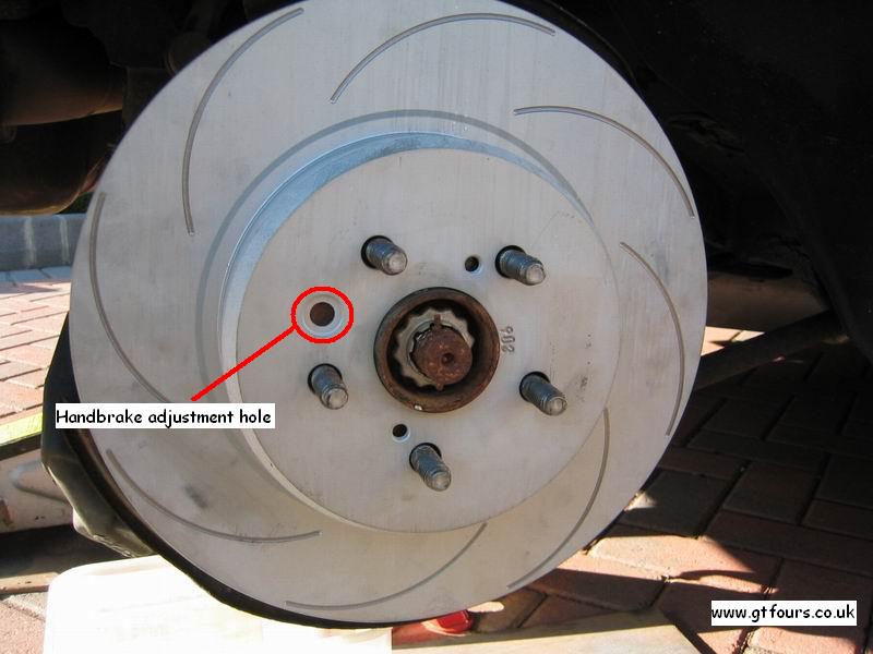 NB - make sure that the handbrake adjustment hole on the disk lines up with the handbrake adjustment hole on the hub as indicated