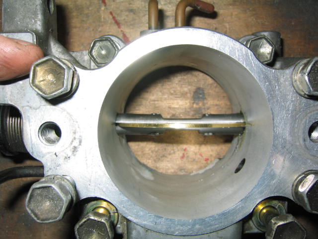 New TB open. Note the machining undertaken on the butterfly support bar - every little helps! The front edge has now been knife edged to increase flow further |