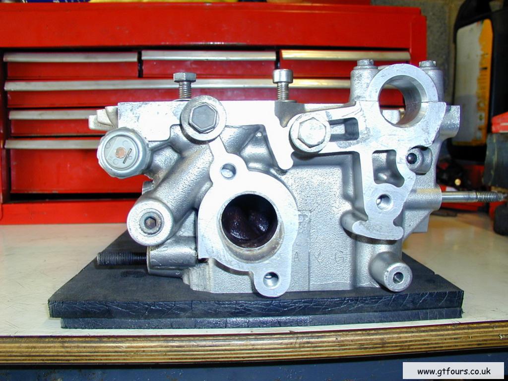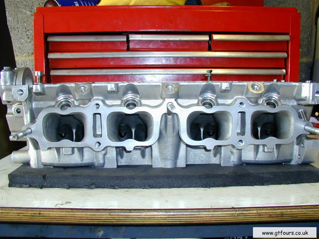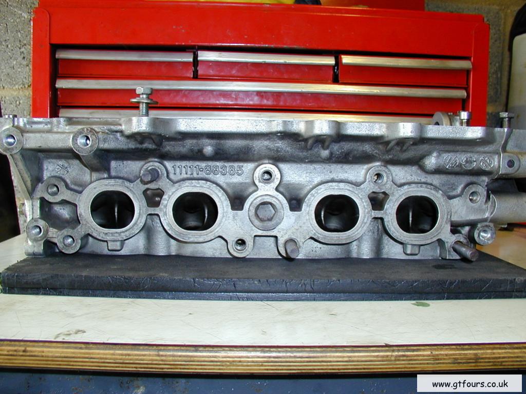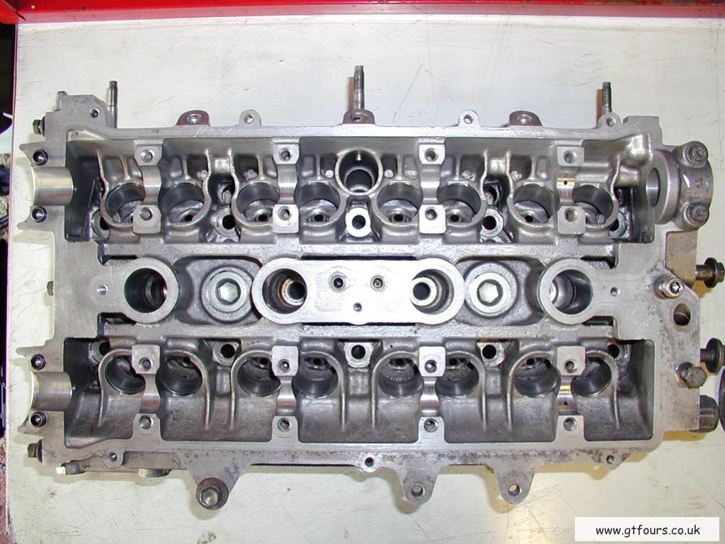 | Bare head. All valves, springs, buckets etc removed | This view shows the exhaust side of the cylinder head | A close up of the exhaust ports | Side view of the head |