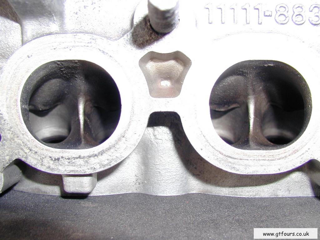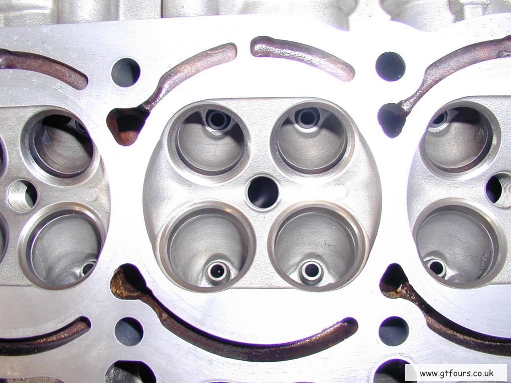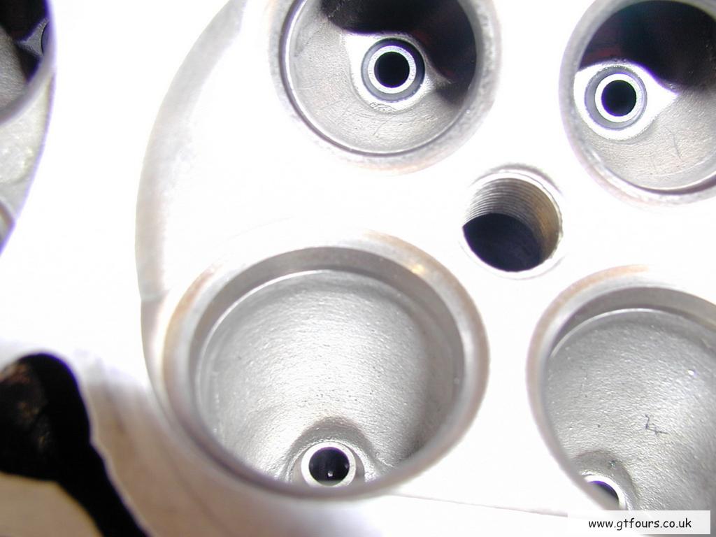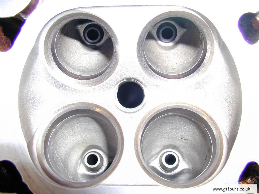 | A closer picture of the combustion area | You can quite clearly see the valve seats that are pressed into the head in this picture | ||