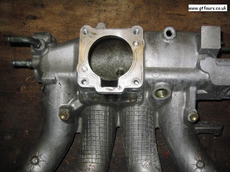 | This pipe feeds the manifold pressure to the Turbo Pressure Sensor | Throttle body mounting point. Note the Inlet Air Temp sensor has been removed from adjacent to the bottom right hand corner of the throttle body mounting | The WRC had what looks like a cold start injector in the mouth of the intake - this appears to be a form of Water Injection system | The design of the runners are smoother than that of the 165 or 185 |