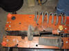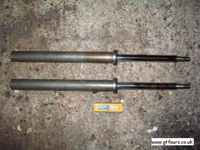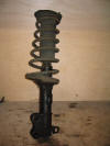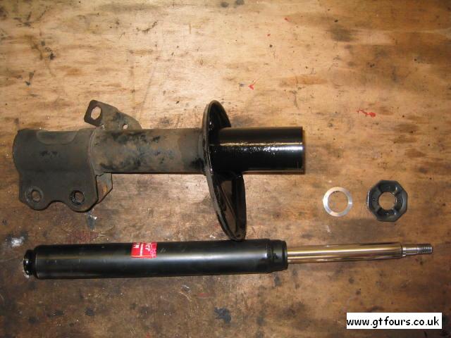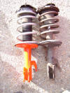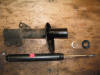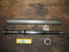 | Front suspension leg comes apart to accept replacement shock inserts | Stock front shock inserts | The rod removed from the sleeve | Top to strut - note the flats that positively locate into the top mount |