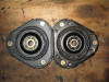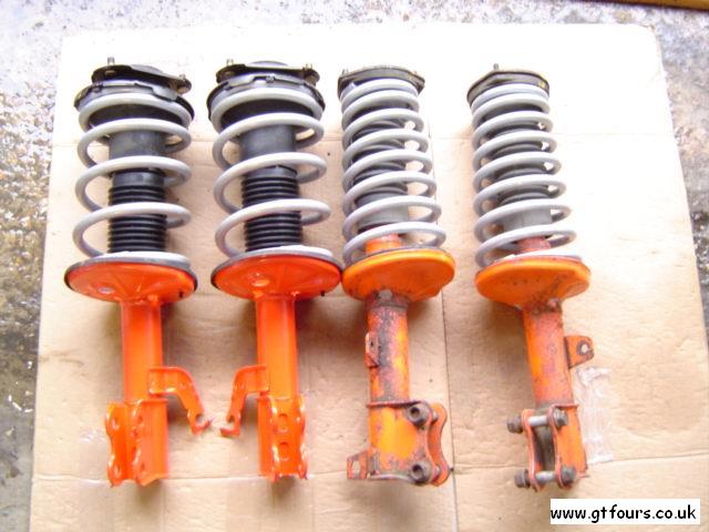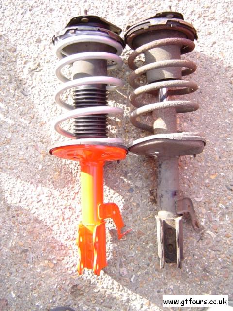 | Stock rear suspension leg | What the rear suspension leg looks like minus spring. Note that the rears are sealed and cannot accommodate replacement inserts, without cutting and welding... | Fensport 20% uprated rear spring vs stock rear spring | New vs old front top mount. Ignore the 6 holes in the rhs mount, these were made in an effort to separate the 2 halves on the top mount... |