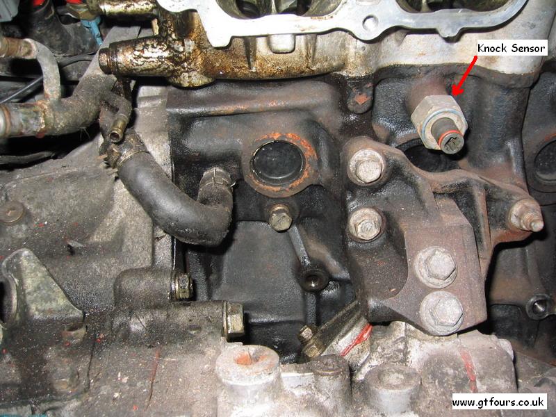 The top bracket, and the location of the knock sensor |