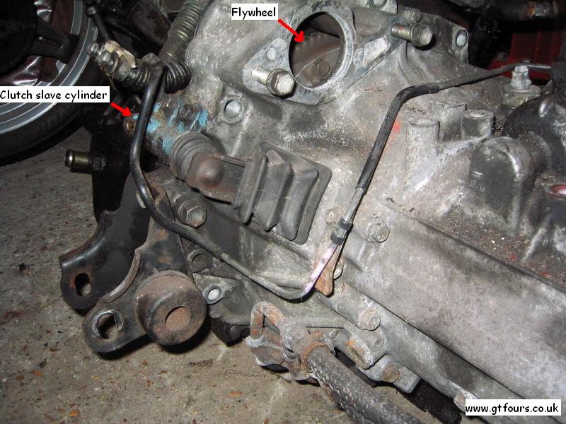 | The clutch is hydraulic on all the GT4s. The slave cylinder pushes against the release fork thereby separating the friction plate from the flywheel |